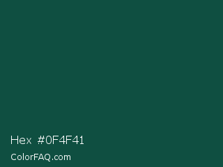 Hex #0f4f41 Color is a very dark cyan color and the nearest color is Brunswick Green #1b4d3e. Hex code #0f4f41 and RGB value is rgb(15,79,65). In RGB color space, this color is composed of 6% red, 31% green, 25% blue, In CMYK color space, this color is composed of 81% cyan, 0% magenta, 18% yellow , 69% black , In HSL color space, this color has a hue angle of 167° , 68% saturation and 18% lightness.