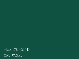 Hex #0f5242 Color is a very dark cyan color and the nearest color is Brunswick Green #1b4d3e. Hex code #0f5242 and RGB value is rgb(15,82,66). In RGB color space, this color is composed of 6% red, 32% green, 26% blue, In CMYK color space, this color is composed of 82% cyan, 0% magenta, 20% yellow , 68% black , In HSL color space, this color has a hue angle of 166° , 69% saturation and 19% lightness.