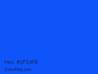 Hex #0f54f8 Color is a normal blue color and the nearest color is Blue RYB #0247fe. Hex code #0f54f8 and RGB value is rgb(15,84,248). In RGB color space, this color is composed of 6% red, 33% green, 97% blue, In CMYK color space, this color is composed of 94% cyan, 66% magenta, 0% yellow , 3% black , In HSL color space, this color has a hue angle of 222° , 94% saturation and 52% lightness.