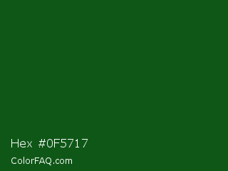 Hex #0f5717 Color is a very dark green color and the nearest color is Parsley #134f19. Hex code #0f5717 and RGB value is rgb(15,87,23). In RGB color space, this color is composed of 6% red, 34% green, 9% blue, In CMYK color space, this color is composed of 83% cyan, 0% magenta, 74% yellow , 66% black , In HSL color space, this color has a hue angle of 127° , 71% saturation and 20% lightness.