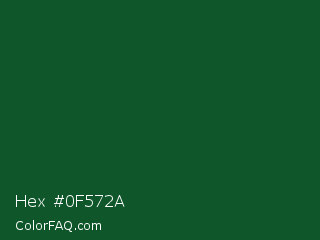 Hex #0f572a Color is a very dark green color and the nearest color is Cal Poly Pomona Green #1e4d2b. Hex code #0f572a and RGB value is rgb(15,87,42). In RGB color space, this color is composed of 6% red, 34% green, 16% blue, In CMYK color space, this color is composed of 83% cyan, 0% magenta, 52% yellow , 66% black , In HSL color space, this color has a hue angle of 143° , 71% saturation and 20% lightness.