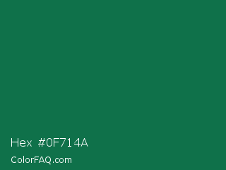 Hex #0f714a Color is a dark green color and the nearest color is Dark Spring Green #177245. Hex code #0f714a and RGB value is rgb(15,113,74). In RGB color space, this color is composed of 6% red, 44% green, 29% blue, In CMYK color space, this color is composed of 87% cyan, 0% magenta, 35% yellow , 56% black , In HSL color space, this color has a hue angle of 156° , 77% saturation and 25% lightness.