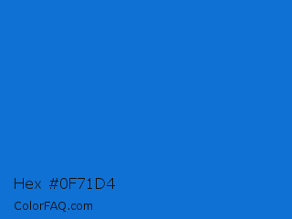 Hex #0f71d4 Color is a normal blue color and the nearest color is Bright Navy Blue #1974d2. Hex code #0f71d4 and RGB value is rgb(15,113,212). In RGB color space, this color is composed of 6% red, 44% green, 83% blue, In CMYK color space, this color is composed of 93% cyan, 47% magenta, 0% yellow , 17% black , In HSL color space, this color has a hue angle of 210° , 87% saturation and 45% lightness.