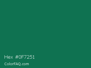 Hex #0f7251 Color is a dark green color and the nearest color is Watercourse #056f57. Hex code #0f7251 and RGB value is rgb(15,114,81). In RGB color space, this color is composed of 6% red, 45% green, 32% blue, In CMYK color space, this color is composed of 87% cyan, 0% magenta, 29% yellow , 55% black , In HSL color space, this color has a hue angle of 160° , 77% saturation and 25% lightness.