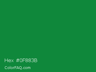 Hex #0f883b Color is a dark green color and the nearest color is North Texas Green #059033. Hex code #0f883b and RGB value is rgb(15,136,59). In RGB color space, this color is composed of 6% red, 53% green, 23% blue, In CMYK color space, this color is composed of 89% cyan, 0% magenta, 57% yellow , 47% black , In HSL color space, this color has a hue angle of 142° , 80% saturation and 30% lightness.