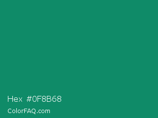 Hex #0f8b68 Color is a dark green color and the nearest color is Elf Green #088370. Hex code #0f8b68 and RGB value is rgb(15,139,104). In RGB color space, this color is composed of 6% red, 55% green, 41% blue, In CMYK color space, this color is composed of 89% cyan, 0% magenta, 25% yellow , 45% black , In HSL color space, this color has a hue angle of 163° , 81% saturation and 30% lightness.