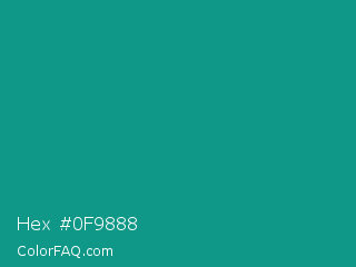 Hex #0f9888 Color is a normal cyan color and the nearest color is Gossamer #069b81. Hex code #0f9888 and RGB value is rgb(15,152,136). In RGB color space, this color is composed of 6% red, 60% green, 53% blue, In CMYK color space, this color is composed of 90% cyan, 0% magenta, 11% yellow , 40% black , In HSL color space, this color has a hue angle of 173° , 82% saturation and 33% lightness.