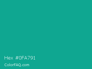 Hex #0fa791 Color is a normal cyan color and the nearest color is Niagara #06a189. Hex code #0fa791 and RGB value is rgb(15,167,145). In RGB color space, this color is composed of 6% red, 65% green, 57% blue, In CMYK color space, this color is composed of 91% cyan, 0% magenta, 13% yellow , 35% black , In HSL color space, this color has a hue angle of 171° , 84% saturation and 36% lightness.