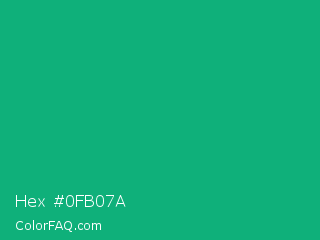 Hex #0fb07a Color is a normal green color and the nearest color is Green Crayola #1cac78. Hex code #0fb07a and RGB value is rgb(15,176,122). In RGB color space, this color is composed of 6% red, 69% green, 48% blue, In CMYK color space, this color is composed of 91% cyan, 0% magenta, 31% yellow , 31% black , In HSL color space, this color has a hue angle of 160° , 84% saturation and 37% lightness.