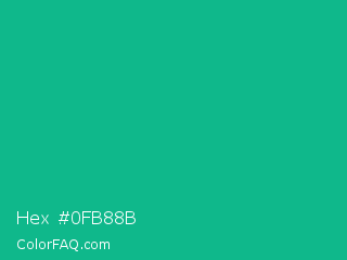 Hex #0fb88b Color is a normal cyan color and the nearest color is Mountain Meadow Crayola #1ab385. Hex code #0fb88b and RGB value is rgb(15,184,139). In RGB color space, this color is composed of 6% red, 72% green, 55% blue, In CMYK color space, this color is composed of 92% cyan, 0% magenta, 24% yellow , 28% black , In HSL color space, this color has a hue angle of 164° , 85% saturation and 39% lightness.