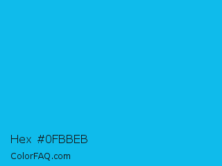 Hex #0fbbeb Color is a normal cyan color and the nearest color is Cyan Process #00b7eb. Hex code #0fbbeb and RGB value is rgb(15,187,235). In RGB color space, this color is composed of 6% red, 73% green, 92% blue, In CMYK color space, this color is composed of 94% cyan, 20% magenta, 0% yellow , 8% black , In HSL color space, this color has a hue angle of 193° , 88% saturation and 49% lightness.