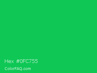 Hex #0fc755 Color is a normal green color and the nearest color is Malachite #0bda51. Hex code #0fc755 and RGB value is rgb(15,199,85). In RGB color space, this color is composed of 6% red, 78% green, 33% blue, In CMYK color space, this color is composed of 92% cyan, 0% magenta, 57% yellow , 22% black , In HSL color space, this color has a hue angle of 143° , 86% saturation and 42% lightness.