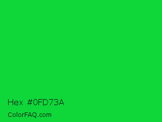 Hex #0fd73a Color is a normal green color and the nearest color is Vivid Malachite #00cc33. Hex code #0fd73a and RGB value is rgb(15,215,58). In RGB color space, this color is composed of 6% red, 84% green, 23% blue, In CMYK color space, this color is composed of 93% cyan, 0% magenta, 73% yellow , 16% black , In HSL color space, this color has a hue angle of 133° , 87% saturation and 45% lightness.