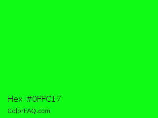 Hex #0ffc17 Color is a normal green color and the nearest color is Green #00ff00. Hex code #0ffc17 and RGB value is rgb(15,252,23). In RGB color space, this color is composed of 6% red, 99% green, 9% blue, In CMYK color space, this color is composed of 94% cyan, 0% magenta, 91% yellow , 1% black , In HSL color space, this color has a hue angle of 122° , 98% saturation and 52% lightness.