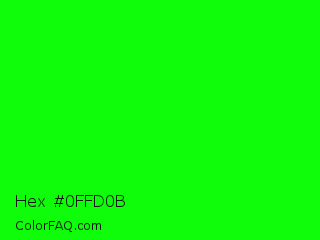 Hex #0ffd0b Color is a normal green color and the nearest color is Green #00ff00. Hex code #0ffd0b and RGB value is rgb(15,253,11). In RGB color space, this color is composed of 6% red, 99% green, 4% blue, In CMYK color space, this color is composed of 94% cyan, 0% magenta, 96% yellow , 1% black , In HSL color space, this color has a hue angle of 119° , 98% saturation and 52% lightness.