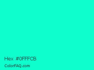 Hex #0fffcb Color is a normal cyan color and the nearest color is Bright Turquoise #08e8de. Hex code #0fffcb and RGB value is rgb(15,255,203). In RGB color space, this color is composed of 6% red, 100% green, 80% blue, In CMYK color space, this color is composed of 94% cyan, 0% magenta, 20% yellow , 0% black , In HSL color space, this color has a hue angle of 167° , 100% saturation and 53% lightness.