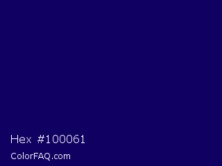 Hex #100061 Color is a very dark indigo color and the nearest color is Arapawa #110c6c. Hex code #100061 and RGB value is rgb(16,0,97). In RGB color space, this color is composed of 6% red, 0% green, 38% blue, In CMYK color space, this color is composed of 84% cyan, 100% magenta, 0% yellow , 62% black , In HSL color space, this color has a hue angle of 250° , 100% saturation and 19% lightness.