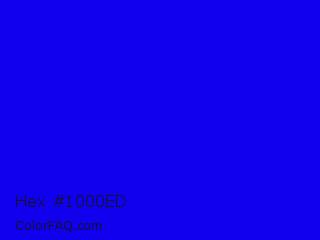 Hex #1000ed Color is a normal indigo color and the nearest color is Blue #0000ff. Hex code #1000ed and RGB value is rgb(16,0,237). In RGB color space, this color is composed of 6% red, 0% green, 93% blue, In CMYK color space, this color is composed of 93% cyan, 100% magenta, 0% yellow , 7% black , In HSL color space, this color has a hue angle of 244° , 100% saturation and 46% lightness.