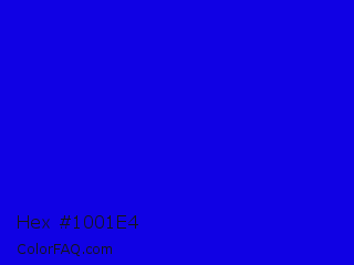 Hex #1001e4 Color is a normal indigo color and the nearest color is Medium Blue #0000cd. Hex code #1001e4 and RGB value is rgb(16,1,228). In RGB color space, this color is composed of 6% red, 0% green, 89% blue, In CMYK color space, this color is composed of 93% cyan, 100% magenta, 0% yellow , 11% black , In HSL color space, this color has a hue angle of 244° , 99% saturation and 45% lightness.