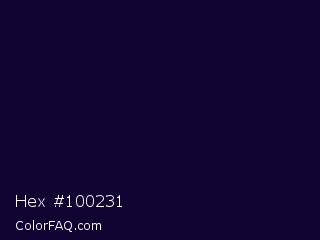 Hex #100231 Color is a very dark indigo color and the nearest color is Black Rock #0d0332. Hex code #100231 and RGB value is rgb(16,2,49). In RGB color space, this color is composed of 6% red, 1% green, 19% blue, In CMYK color space, this color is composed of 67% cyan, 96% magenta, 0% yellow , 81% black , In HSL color space, this color has a hue angle of 258° , 92% saturation and 10% lightness.