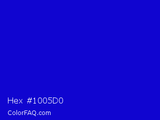 Hex #1005d0 Color is a normal indigo color and the nearest color is Medium Blue #0000cd. Hex code #1005d0 and RGB value is rgb(16,5,208). In RGB color space, this color is composed of 6% red, 2% green, 82% blue, In CMYK color space, this color is composed of 92% cyan, 98% magenta, 0% yellow , 18% black , In HSL color space, this color has a hue angle of 243° , 95% saturation and 42% lightness.