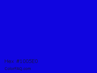 Hex #1005e0 Color is a normal indigo color and the nearest color is Medium Blue #0000cd. Hex code #1005e0 and RGB value is rgb(16,5,224). In RGB color space, this color is composed of 6% red, 2% green, 88% blue, In CMYK color space, this color is composed of 93% cyan, 98% magenta, 0% yellow , 12% black , In HSL color space, this color has a hue angle of 243° , 96% saturation and 45% lightness.