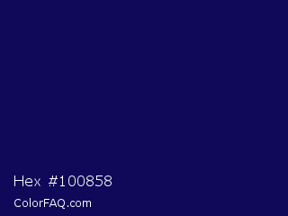 Hex #100858 Color is a very dark indigo color and the nearest color is Gulf Blue #051657. Hex code #100858 and RGB value is rgb(16,8,88). In RGB color space, this color is composed of 6% red, 3% green, 35% blue, In CMYK color space, this color is composed of 82% cyan, 91% magenta, 0% yellow , 65% black , In HSL color space, this color has a hue angle of 246° , 83% saturation and 19% lightness.