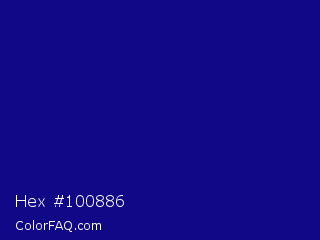 Hex #100886 Color is a dark indigo color and the nearest color is Ultramarine #120a8f. Hex code #100886 and RGB value is rgb(16,8,134). In RGB color space, this color is composed of 6% red, 3% green, 53% blue, In CMYK color space, this color is composed of 88% cyan, 94% magenta, 0% yellow , 47% black , In HSL color space, this color has a hue angle of 244° , 89% saturation and 28% lightness.