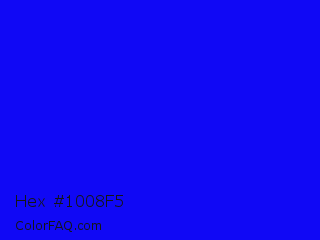 Hex #1008f5 Color is a normal indigo color and the nearest color is Blue #0000ff. Hex code #1008f5 and RGB value is rgb(16,8,245). In RGB color space, this color is composed of 6% red, 3% green, 96% blue, In CMYK color space, this color is composed of 93% cyan, 97% magenta, 0% yellow , 4% black , In HSL color space, this color has a hue angle of 242° , 94% saturation and 50% lightness.