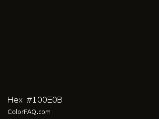 Hex #100e0b Color is a almost black orange color and the nearest color is Smoky Black #100c08. Hex code #100e0b and RGB value is rgb(16,14,11). In RGB color space, this color is composed of 6% red, 5% green, 4% blue, In CMYK color space, this color is composed of 0% cyan, 13% magenta, 31% yellow , 94% black , In HSL color space, this color has a hue angle of 36° , 19% saturation and 5% lightness.