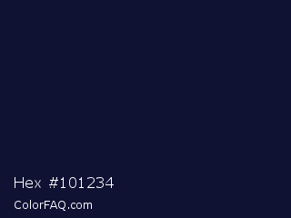 Hex #101234 Color is a very dark blue color and the nearest color is Haiti #1b1035. Hex code #101234 and RGB value is rgb(16,18,52). In RGB color space, this color is composed of 6% red, 7% green, 20% blue, In CMYK color space, this color is composed of 69% cyan, 65% magenta, 0% yellow , 80% black , In HSL color space, this color has a hue angle of 237° , 53% saturation and 13% lightness.