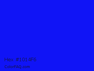 Hex #1014f6 Color is a normal blue color and the nearest color is Bluebonnet #1c1cf0. Hex code #1014f6 and RGB value is rgb(16,20,246). In RGB color space, this color is composed of 6% red, 8% green, 96% blue, In CMYK color space, this color is composed of 93% cyan, 92% magenta, 0% yellow , 4% black , In HSL color space, this color has a hue angle of 239° , 93% saturation and 51% lightness.