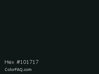 Hex #101717 Color is a almost black cyan color and the nearest color is Aztec #0d1c19. Hex code #101717 and RGB value is rgb(16,23,23). In RGB color space, this color is composed of 6% red, 9% green, 9% blue, In CMYK color space, this color is composed of 30% cyan, 0% magenta, 0% yellow , 91% black , In HSL color space, this color has a hue angle of 180° , 18% saturation and 8% lightness.