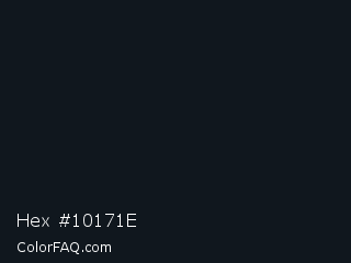 Hex #10171e Color is a almost black blue color and the nearest color is Vulcan #10121d. Hex code #10171e and RGB value is rgb(16,23,30). In RGB color space, this color is composed of 6% red, 9% green, 12% blue, In CMYK color space, this color is composed of 47% cyan, 23% magenta, 0% yellow , 88% black , In HSL color space, this color has a hue angle of 210° , 30% saturation and 9% lightness.