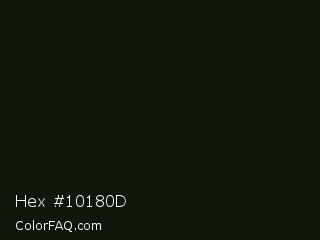 Hex #10180d Color is a almost black green color and the nearest color is Racing Green #0c1911. Hex code #10180d and RGB value is rgb(16,24,13). In RGB color space, this color is composed of 6% red, 9% green, 5% blue, In CMYK color space, this color is composed of 33% cyan, 0% magenta, 46% yellow , 91% black , In HSL color space, this color has a hue angle of 104° , 30% saturation and 7% lightness.