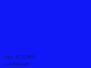 Hex #1018f8 Color is a normal blue color and the nearest color is Bluebonnet #1c1cf0. Hex code #1018f8 and RGB value is rgb(16,24,248). In RGB color space, this color is composed of 6% red, 9% green, 97% blue, In CMYK color space, this color is composed of 94% cyan, 90% magenta, 0% yellow , 3% black , In HSL color space, this color has a hue angle of 238° , 94% saturation and 52% lightness.