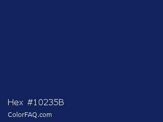 Hex #10235b Color is a very dark blue color and the nearest color is Madison #09255d. Hex code #10235b and RGB value is rgb(16,35,91). In RGB color space, this color is composed of 6% red, 14% green, 36% blue, In CMYK color space, this color is composed of 82% cyan, 62% magenta, 0% yellow , 64% black , In HSL color space, this color has a hue angle of 225° , 70% saturation and 21% lightness.