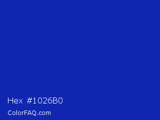 Hex #1026b0 Color is a normal blue color and the nearest color is Egyptian Blue #1034a6. Hex code #1026b0 and RGB value is rgb(16,38,176). In RGB color space, this color is composed of 6% red, 15% green, 69% blue, In CMYK color space, this color is composed of 91% cyan, 78% magenta, 0% yellow , 31% black , In HSL color space, this color has a hue angle of 232° , 83% saturation and 38% lightness.