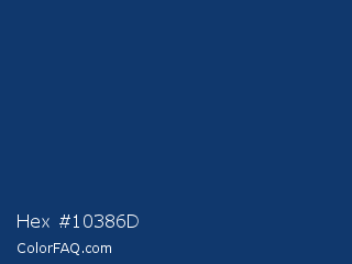 Hex #10386d Color is a dark blue color and the nearest color is Regal Blue #013f6a. Hex code #10386d and RGB value is rgb(16,56,109). In RGB color space, this color is composed of 6% red, 22% green, 43% blue, In CMYK color space, this color is composed of 85% cyan, 49% magenta, 0% yellow , 57% black , In HSL color space, this color has a hue angle of 214° , 74% saturation and 25% lightness.