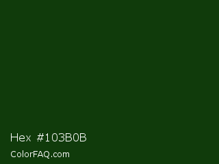 Hex #103b0b Color is a very dark green color and the nearest color is Palm Leaf #19330e. Hex code #103b0b and RGB value is rgb(16,59,11). In RGB color space, this color is composed of 6% red, 23% green, 4% blue, In CMYK color space, this color is composed of 73% cyan, 0% magenta, 81% yellow , 77% black , In HSL color space, this color has a hue angle of 114° , 69% saturation and 14% lightness.