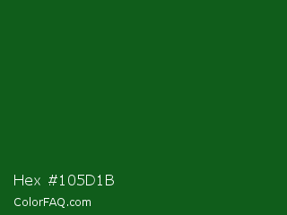 Hex #105d1b Color is a very dark green color and the nearest color is Parsley #134f19. Hex code #105d1b and RGB value is rgb(16,93,27). In RGB color space, this color is composed of 6% red, 36% green, 11% blue, In CMYK color space, this color is composed of 83% cyan, 0% magenta, 71% yellow , 64% black , In HSL color space, this color has a hue angle of 129° , 71% saturation and 21% lightness.