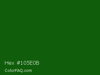 Hex #105e0b Color is a very dark green color and the nearest color is San Felix #0b6207. Hex code #105e0b and RGB value is rgb(16,94,11). In RGB color space, this color is composed of 6% red, 37% green, 4% blue, In CMYK color space, this color is composed of 83% cyan, 0% magenta, 88% yellow , 63% black , In HSL color space, this color has a hue angle of 116° , 79% saturation and 21% lightness.