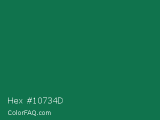 Hex #10734d Color is a dark green color and the nearest color is Dark Spring Green #177245. Hex code #10734d and RGB value is rgb(16,115,77). In RGB color space, this color is composed of 6% red, 45% green, 30% blue, In CMYK color space, this color is composed of 86% cyan, 0% magenta, 33% yellow , 55% black , In HSL color space, this color has a hue angle of 157° , 76% saturation and 26% lightness.
