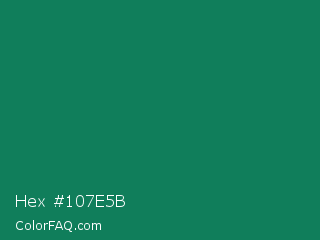 Hex #107e5b Color is a dark green color and the nearest color is Deep Green Cyan Turquoise #0e7c61. Hex code #107e5b and RGB value is rgb(16,126,91). In RGB color space, this color is composed of 6% red, 49% green, 36% blue, In CMYK color space, this color is composed of 87% cyan, 0% magenta, 28% yellow , 51% black , In HSL color space, this color has a hue angle of 161° , 77% saturation and 28% lightness.