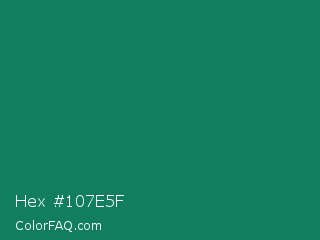Hex #107e5f Color is a dark green color and the nearest color is Deep Green Cyan Turquoise #0e7c61. Hex code #107e5f and RGB value is rgb(16,126,95). In RGB color space, this color is composed of 6% red, 49% green, 37% blue, In CMYK color space, this color is composed of 87% cyan, 0% magenta, 25% yellow , 51% black , In HSL color space, this color has a hue angle of 163° , 77% saturation and 28% lightness.