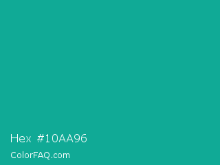 Hex #10aa96 Color is a normal cyan color and the nearest color is Persian Green #00a693. Hex code #10aa96 and RGB value is rgb(16,170,150). In RGB color space, this color is composed of 6% red, 67% green, 59% blue, In CMYK color space, this color is composed of 91% cyan, 0% magenta, 12% yellow , 33% black , In HSL color space, this color has a hue angle of 172° , 83% saturation and 36% lightness.