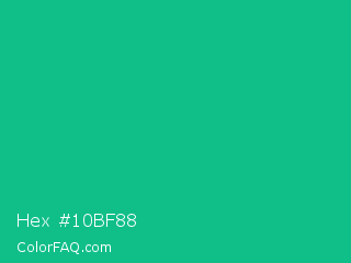 Hex #10bf88 Color is a normal green color and the nearest color is Mountain Meadow Crayola #1ab385. Hex code #10bf88 and RGB value is rgb(16,191,136). In RGB color space, this color is composed of 6% red, 75% green, 53% blue, In CMYK color space, this color is composed of 92% cyan, 0% magenta, 29% yellow , 25% black , In HSL color space, this color has a hue angle of 161° , 85% saturation and 41% lightness.