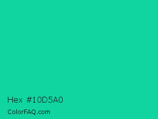 Hex #10d5a0 Color is a normal cyan color and the nearest color is Caribbean Green #00cc99. Hex code #10d5a0 and RGB value is rgb(16,213,160). In RGB color space, this color is composed of 6% red, 84% green, 63% blue, In CMYK color space, this color is composed of 92% cyan, 0% magenta, 25% yellow , 16% black , In HSL color space, this color has a hue angle of 164° , 86% saturation and 45% lightness.