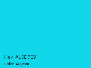 Hex #10d7e9 Color is a normal cyan color and the nearest color is Bright Turquoise #08e8de. Hex code #10d7e9 and RGB value is rgb(16,215,233). In RGB color space, this color is composed of 6% red, 84% green, 91% blue, In CMYK color space, this color is composed of 93% cyan, 8% magenta, 0% yellow , 9% black , In HSL color space, this color has a hue angle of 185° , 87% saturation and 49% lightness.