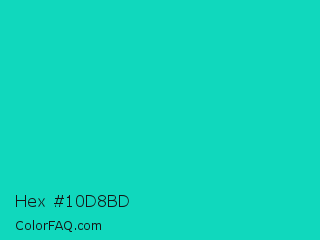 Hex #10d8bd Color is a normal cyan color and the nearest color is Robins Egg Blue #00cccc. Hex code #10d8bd and RGB value is rgb(16,216,189). In RGB color space, this color is composed of 6% red, 85% green, 74% blue, In CMYK color space, this color is composed of 93% cyan, 0% magenta, 13% yellow , 15% black , In HSL color space, this color has a hue angle of 172° , 86% saturation and 45% lightness.